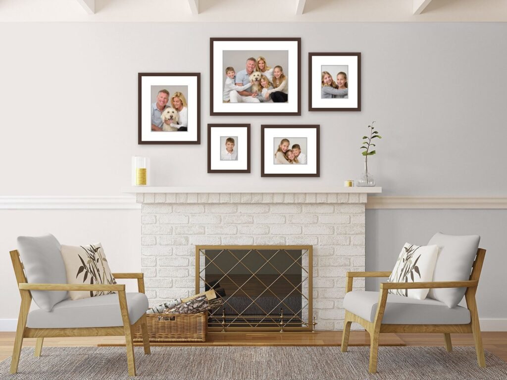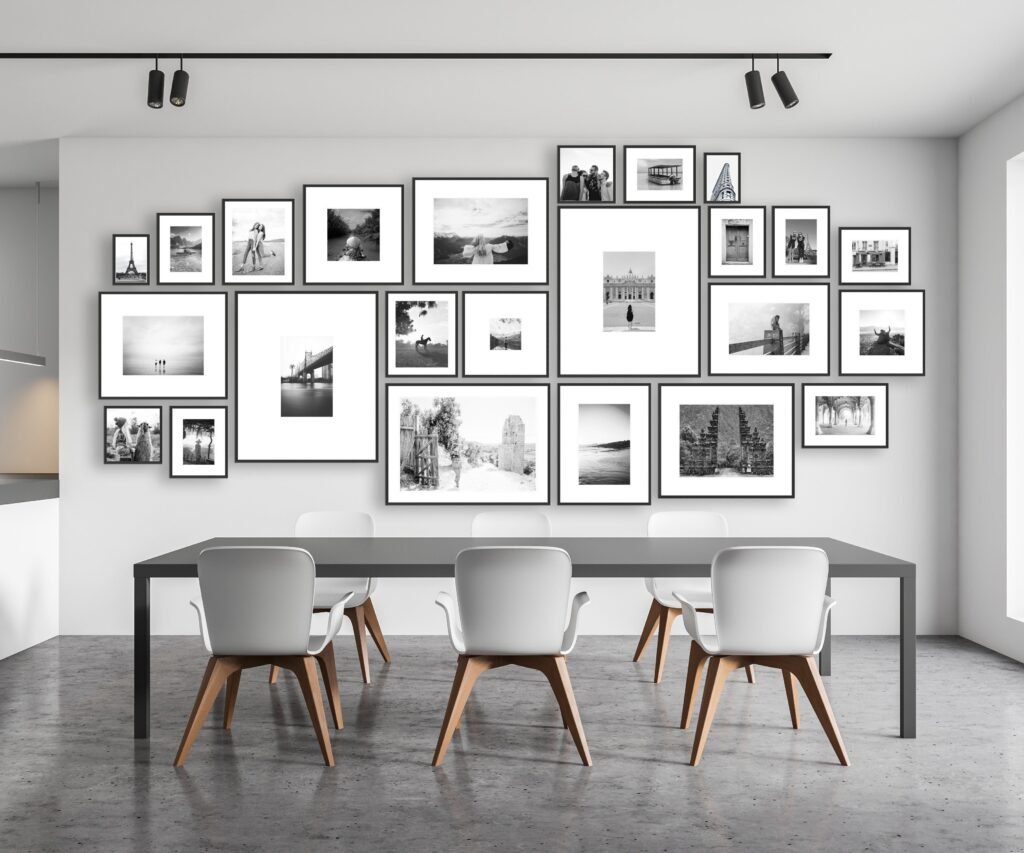 4. قاب عکس‌های بزرگ: از قاب عکس‌های بزرگ و جذاب برای جلب توجه استفاده کنید. یک قاب عکس بزرگ می‌تواند نقطه تمرکز دیوار باشد و به فضا جلوه ویژه‌ای ببخشد.